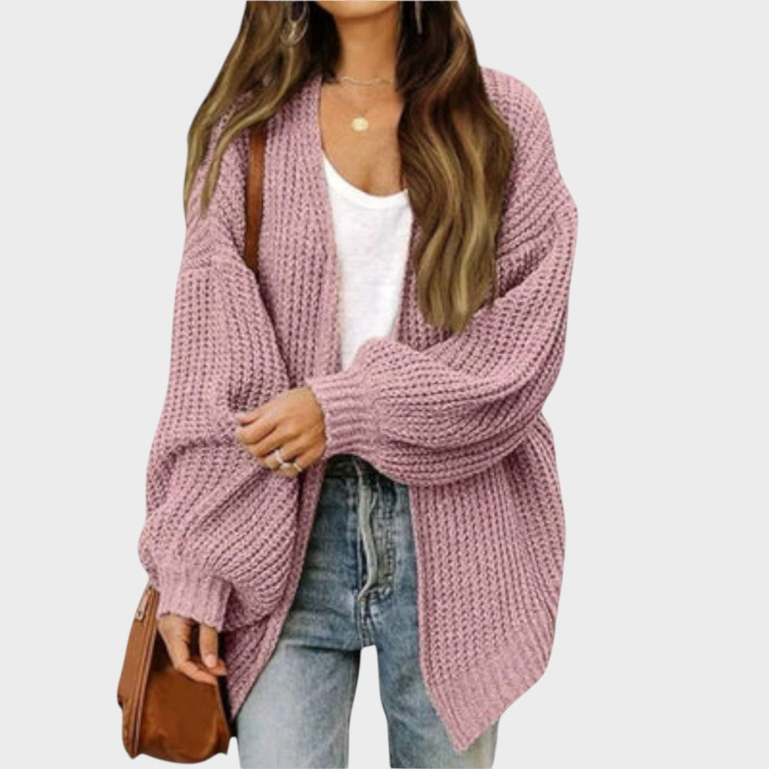 Descubre nuestro cárdigan de corte holgado, diseñado con una textura de punto grueso y mangas amplias. Una elección ideal para looks relajados en capas, combinando verdadero confort con un toque de encanto.